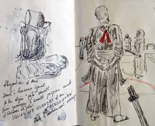 Mientras ella dibujaba parte de esa fachada, le hice este dibujo que no hace honor a su belleza, pero hecho a pluma y en directo y no siendo especialista dijeron que se parecía mucho(?).