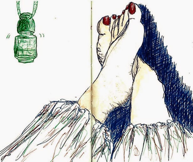 Ja, ja... estupenda manera de pasar el tiempo. Ais, ojos azules, me avocas a la psicoanalización pinreril, ojos azules... Mujer coqueta y segura, la que acicala de color sus uñas en granates, borgoña o en un "Aurora red"... Cuerpo acaso menudo. Cabeza inteligente, la que para crecer un palmo elige unas cuñas y no tacones... aunque siendo una mujer arriesgada, también los use -los tacones- y así, sus pulgares pinreleros, se encaminen hacia un más que probable futuro hallux valgus... Por el segundo dibujo, bien podría decirse que la pinreril propietaria es amante de la cómoda ropa de fibras naturales y estilo étnico para momentos relajados en los que quemadores de aceites, velas y fragancias embriaguen el ambiente y la hagan viajar, quien sabe si a la India o al Machu-pichu sobre su mullida alfombra azul de pelo largo... Un poco de deporte no viene mal al cuerpo, parece decirme el último pinrel reposante, cuya pantorrilla se me antoja de propietario masculino... y que bien podría estar en modo descanso o en modo "averiado"...
