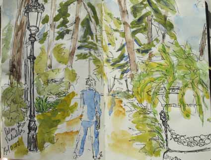Como tengo que andar, aproveché para ir hasta el Palacio de Pedralbes de Barcelona, era un buen dia. Llevé mi libretita, la caja pequeña de acuarelas, y estrené unos rotuladores brillantes en la barandilla del siguiente esbozo. Seguí llenando páginas,